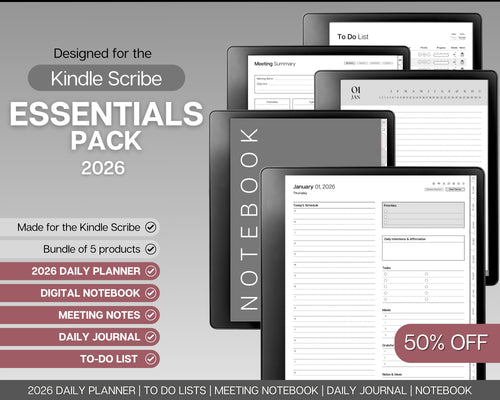 Templates for Kindle Scribe, ESSENTIALS PACK, 2026 Daily Planner, Digital To Do List, Meeting Minutes Meeting Notes, Journal Notebook