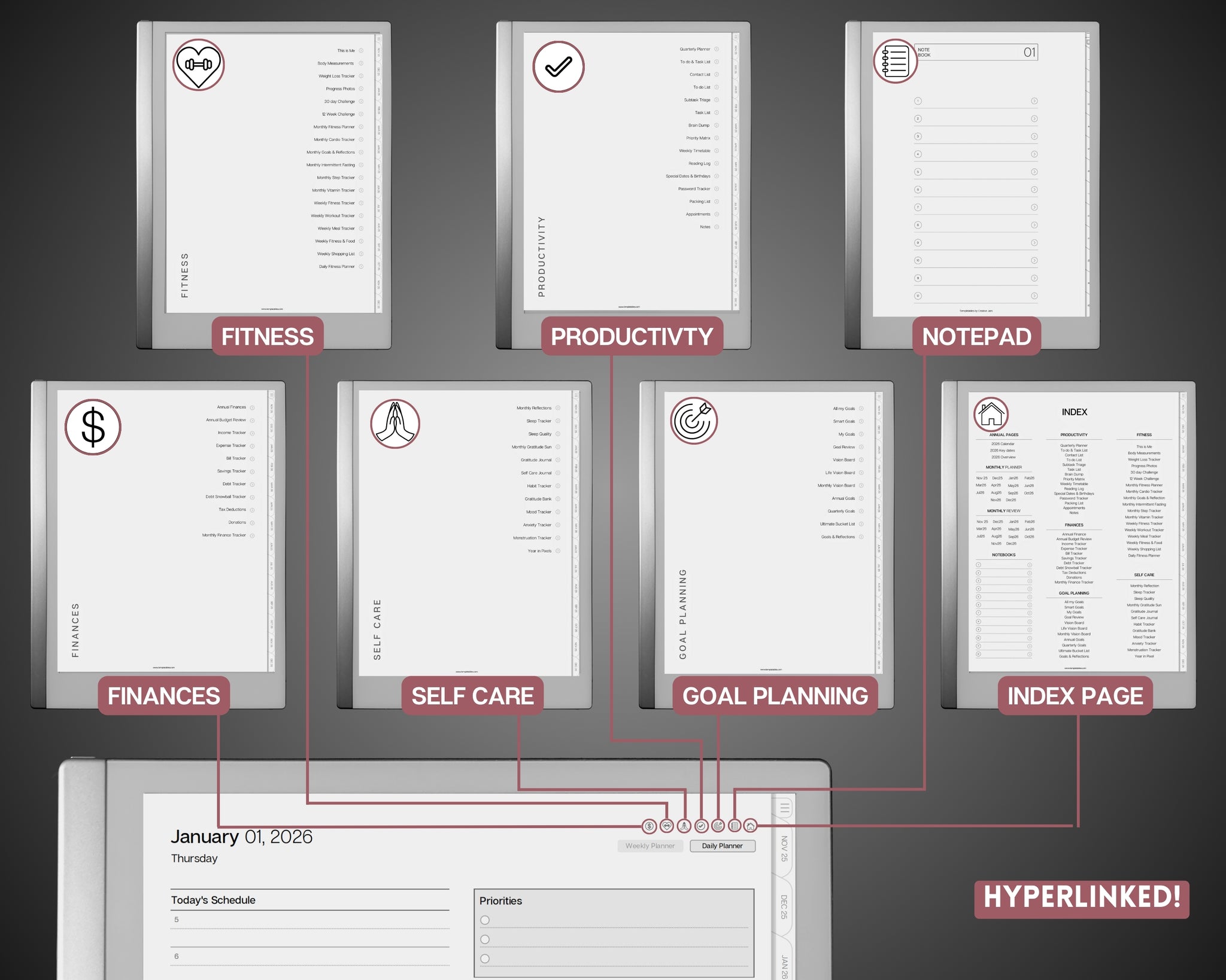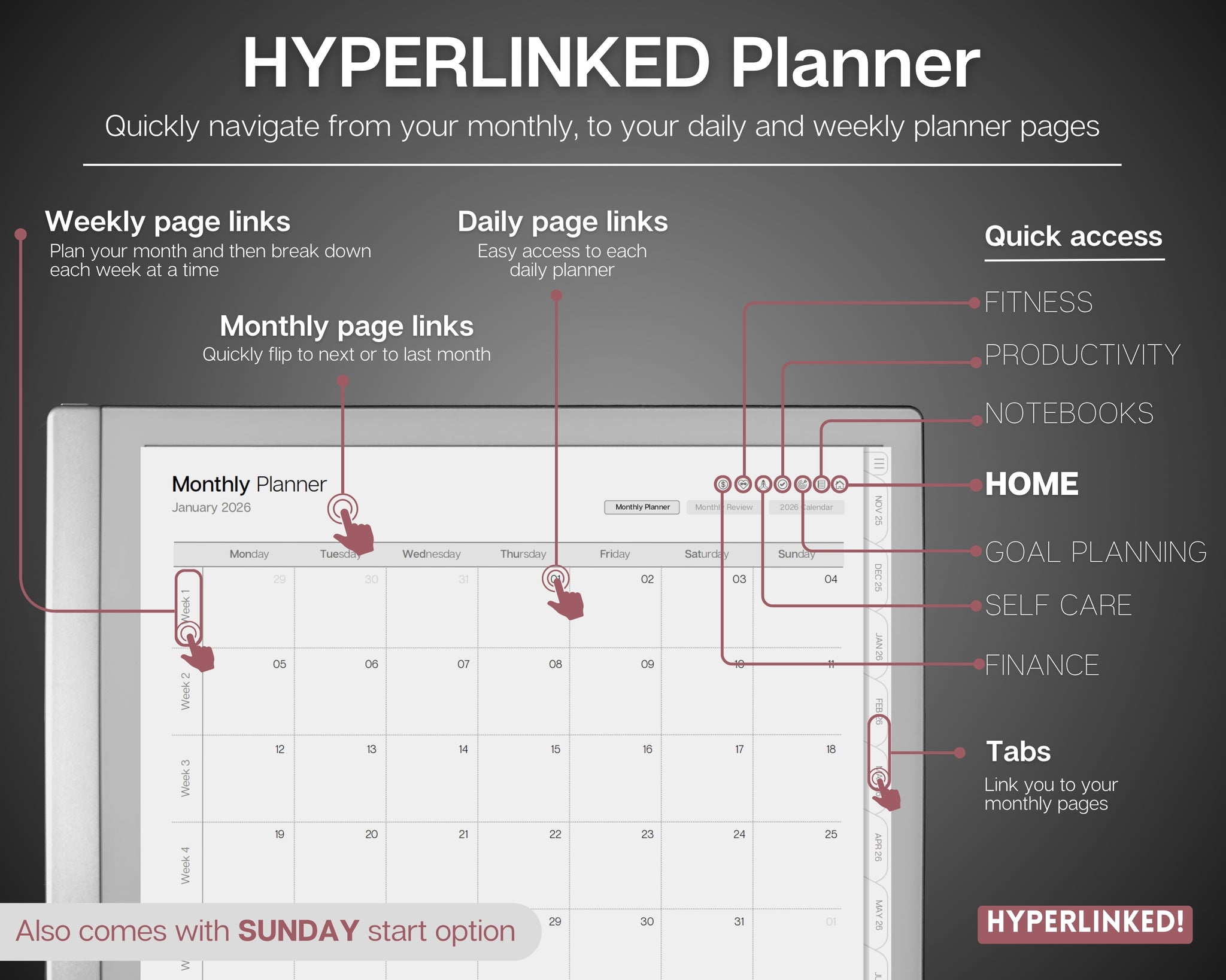 ✅ Plan, schedule and organize each day of the week and month with this hyperlinked digital daily planner, including over 700 pages, 60+ templates, 10 Notebooks and 40 notes templates for 2026 (Monday and Sunday starts included!) ✅