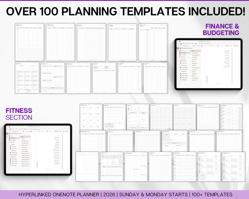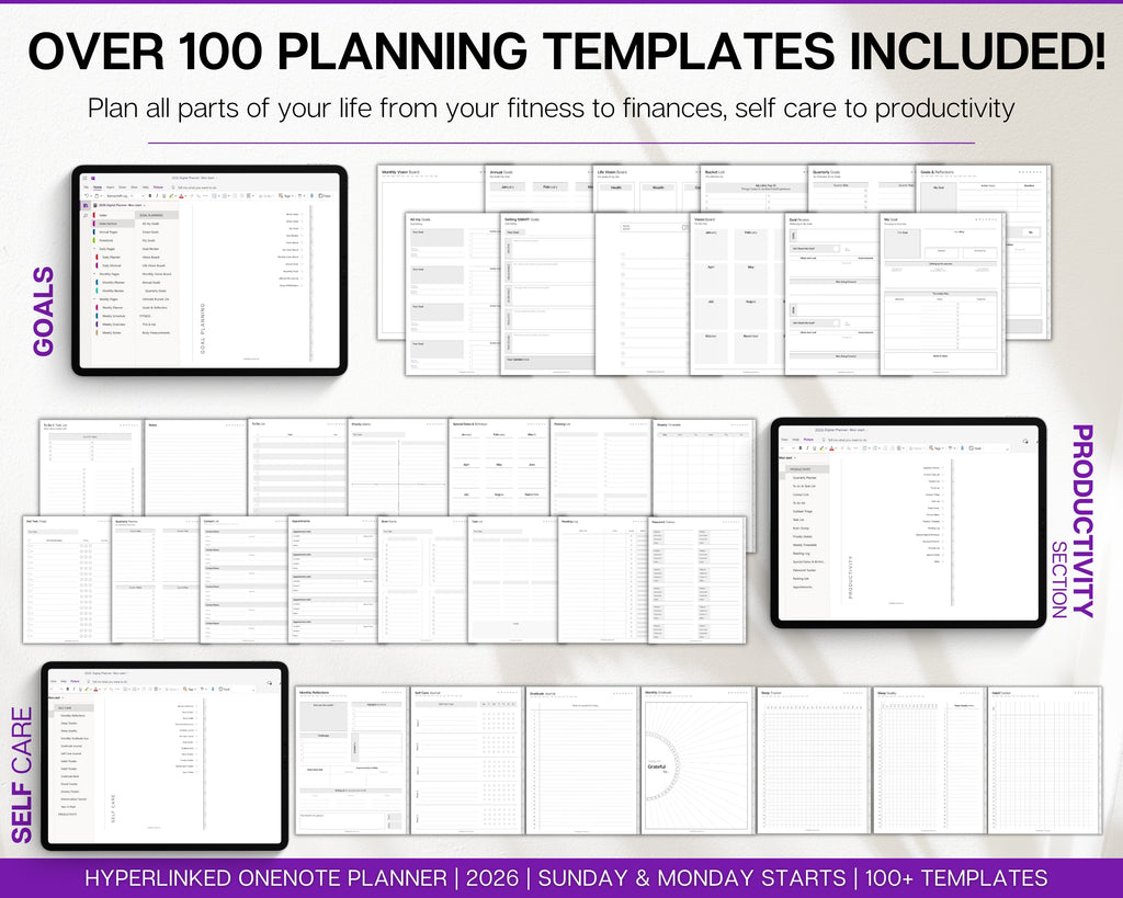 ✔ Over 100 additional planning templates also included covering: Productivity, Fitness, Finances, Self Care and Goal planning.
