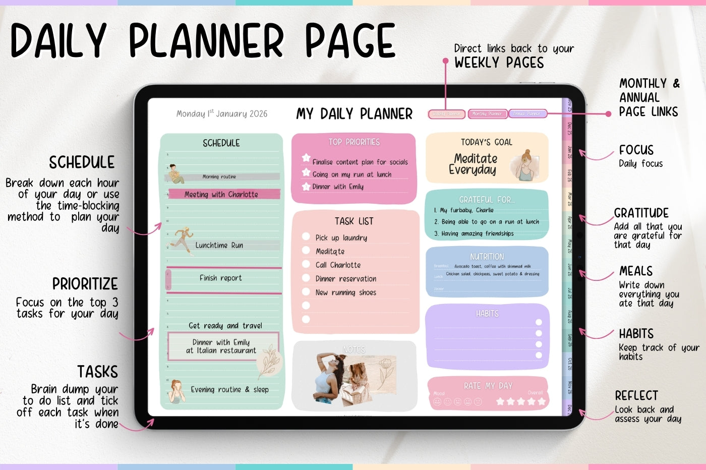 Each daily page holds your schedule, top priorities, task list, notes, habits, nutrition, gratitude, goal, and mood tracker.