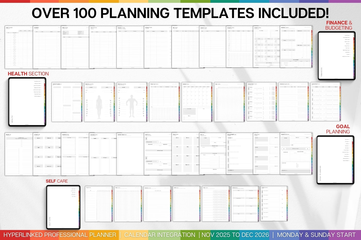 ✔ Over 100 additional planning templates also included covering: Productivity, Fitness, Finances, Self Care and Goal planning.