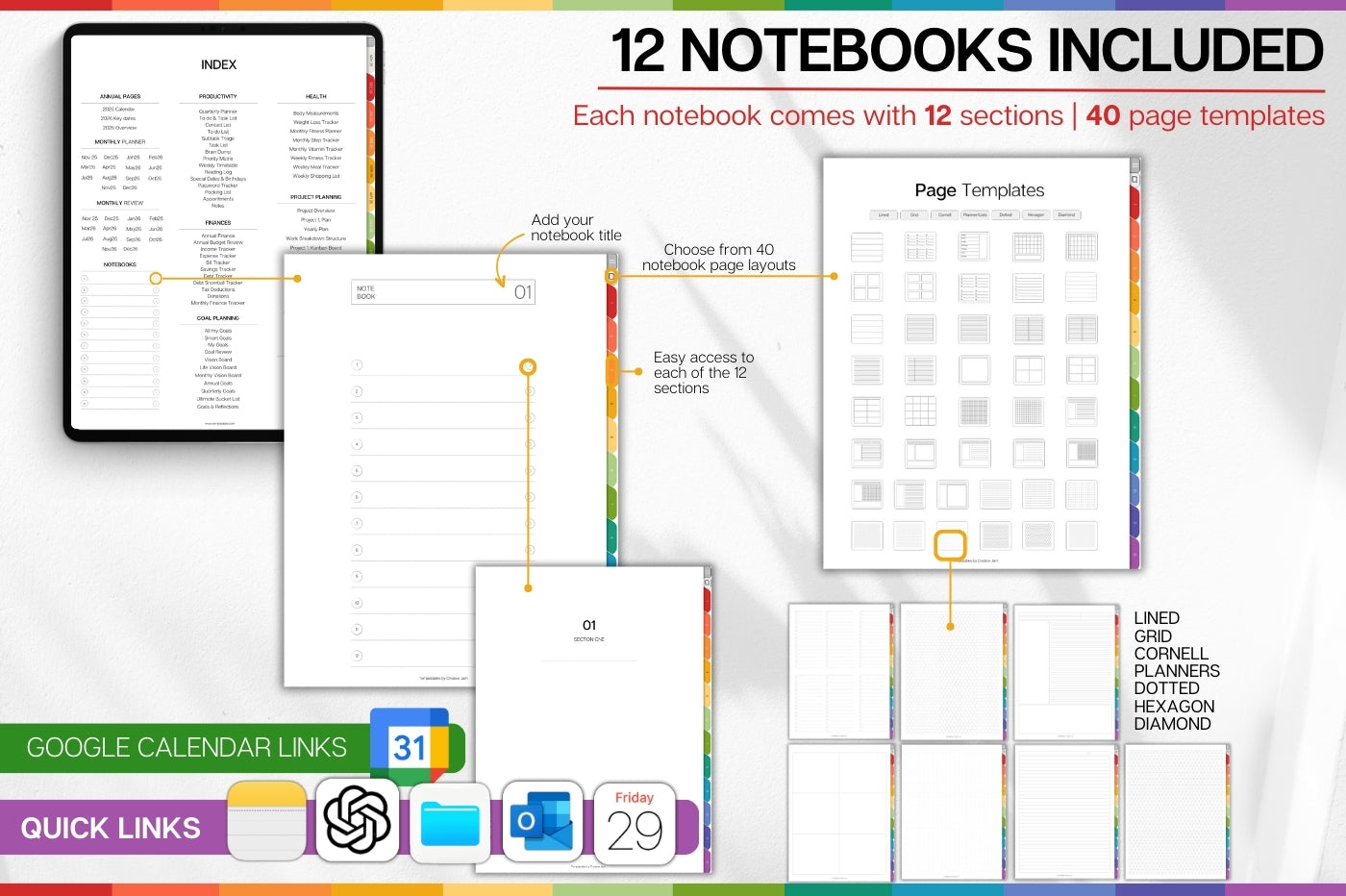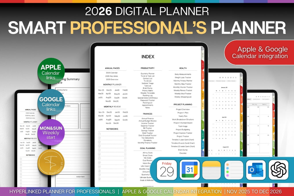✅ FEATURES ✅ ✔ 2026 Digital Planner ✔ Made especially for professionals ✔ 100+ pro templates: project roadmaps, meeting notes, objectives-and-key-results, budgets & more ✔ Integration with 8 apps: Apple Calendar, Chat GPT, MS Outlook, Google Calendar, Apple Note, Apple Reminders, Apple Mail & Files ✔ Choose your own planning style: daily, weekly, monthly or annually ✔ Chose from the Sunday and Monday-start versions ✔ Over 30k hyperlinks across the planner so you can navigate between the pages with ease ✔ Over 100 additional planning templates also included covering: Productivity, Fitness, Finances, Self Care and Goal planning. ✔ 12 Notebooks with 12 sections each ✔ 40+ note page templates to choose from ✔ BONUS: 300+ planner covers