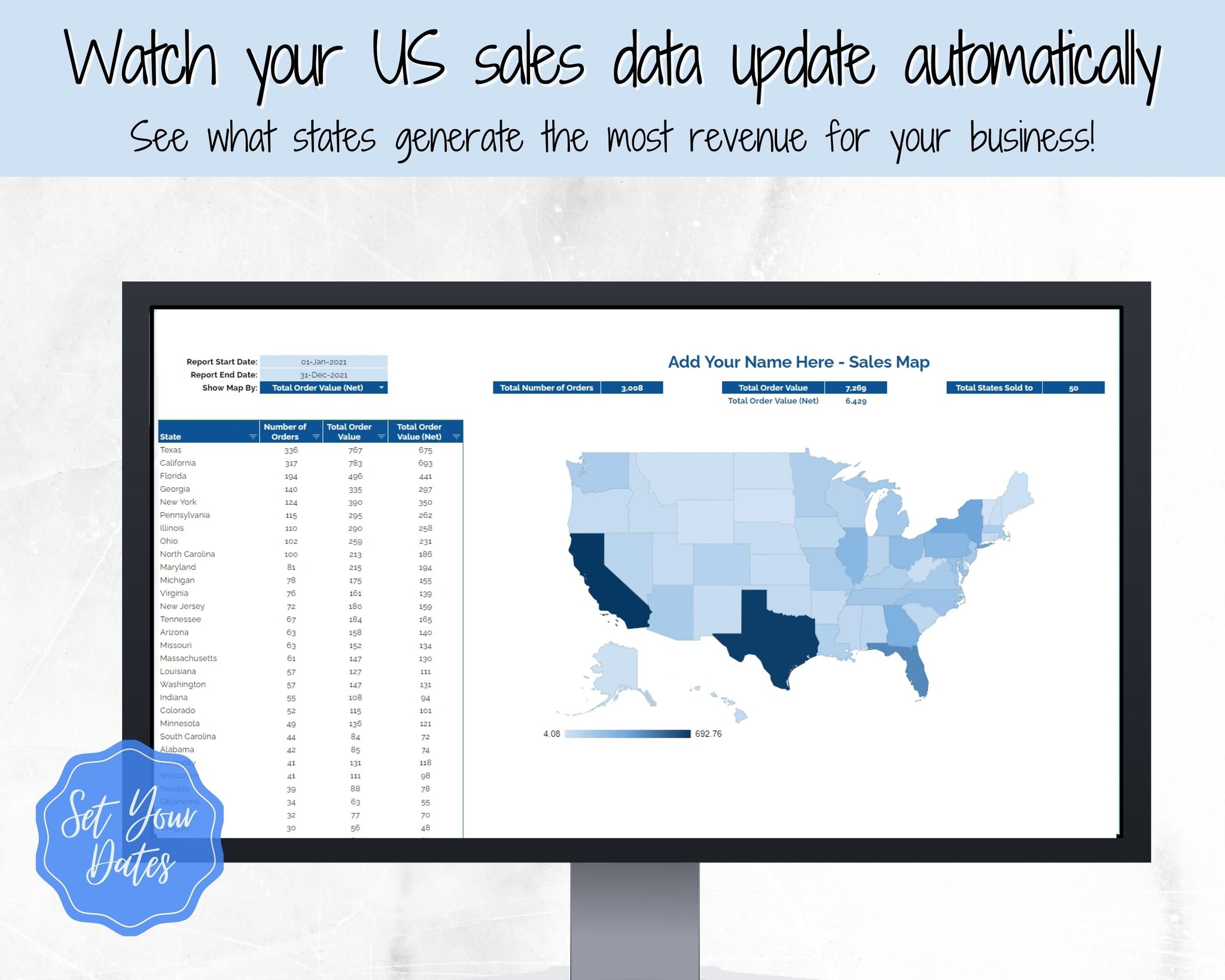 This automated US State Sales Map is perfect for keeping track of your business sales across America! Add you business name and sales data and watch the spreadsheet automatically update and see all of the states within the USA you have sold to! Allows you as a business owner to easily track and display your orders, order value and net order value across the United States.