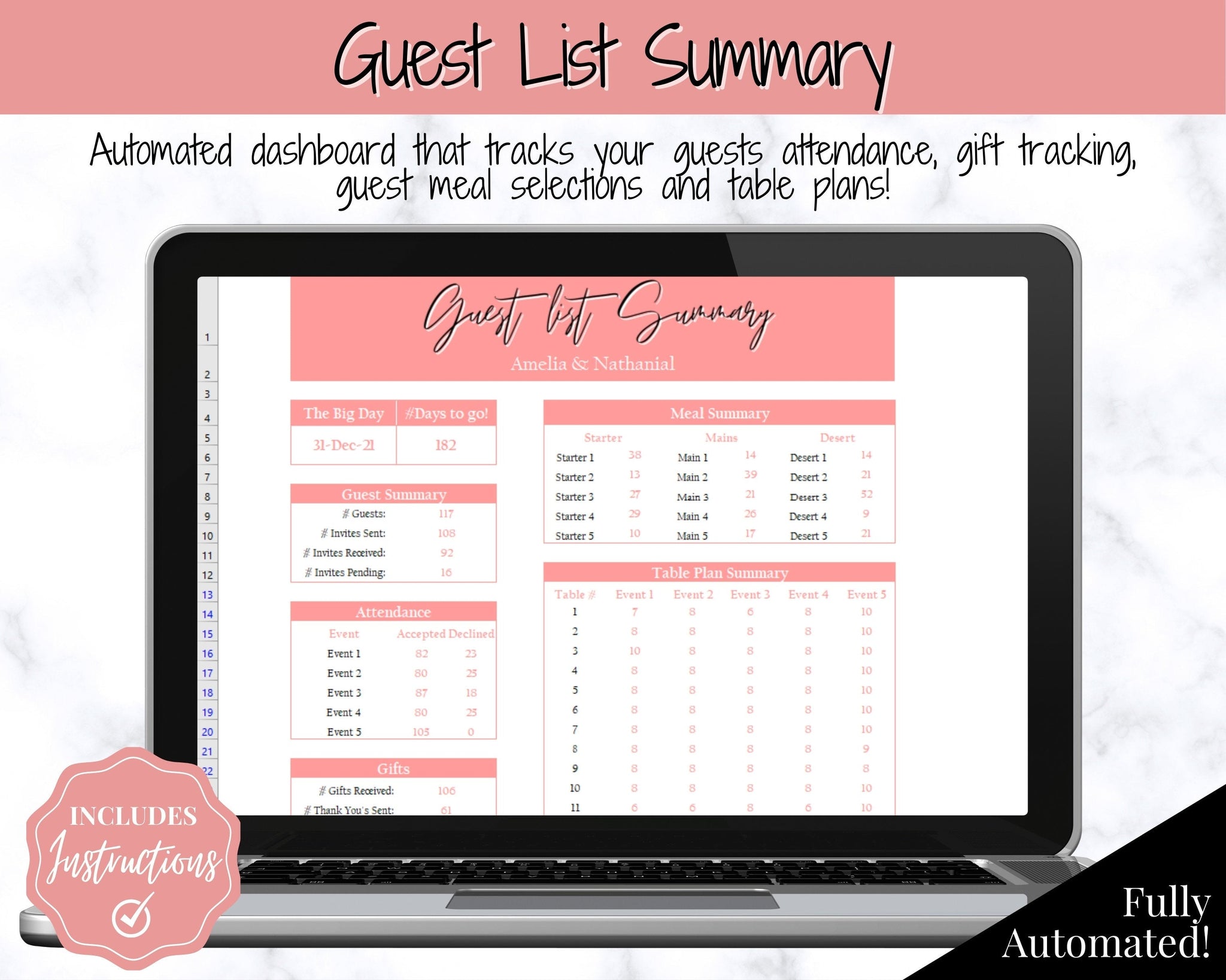 ✔ Guest list tracker where you can enter all your guest contact details, attendance to events, RSVPs, and gifts