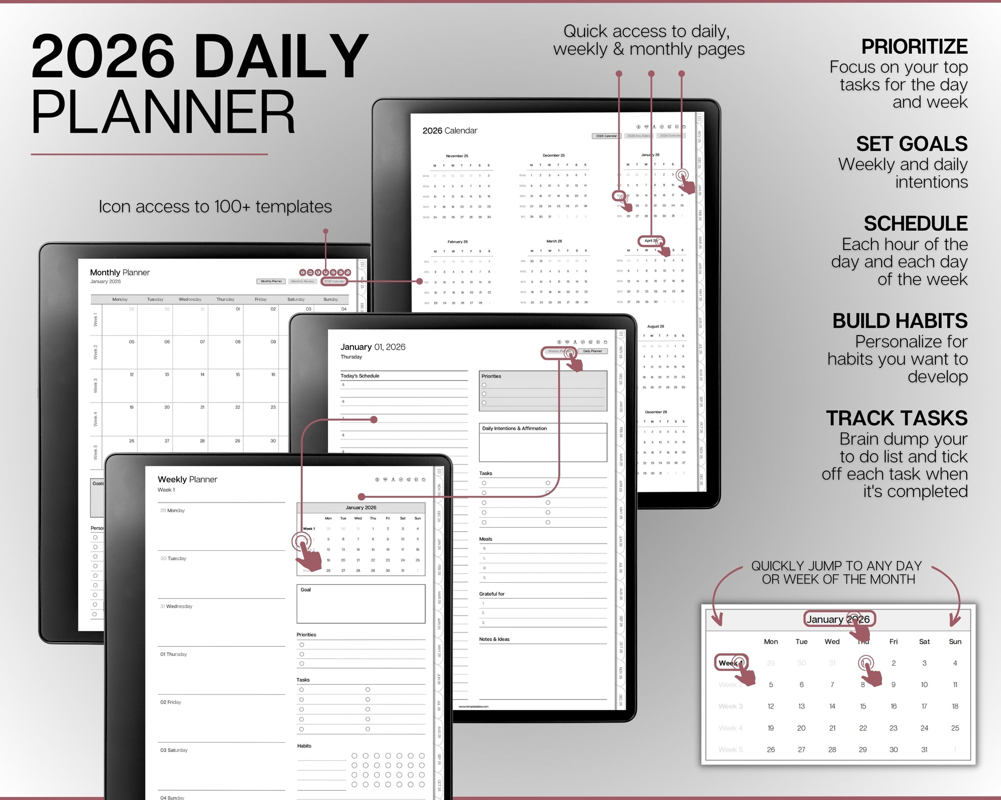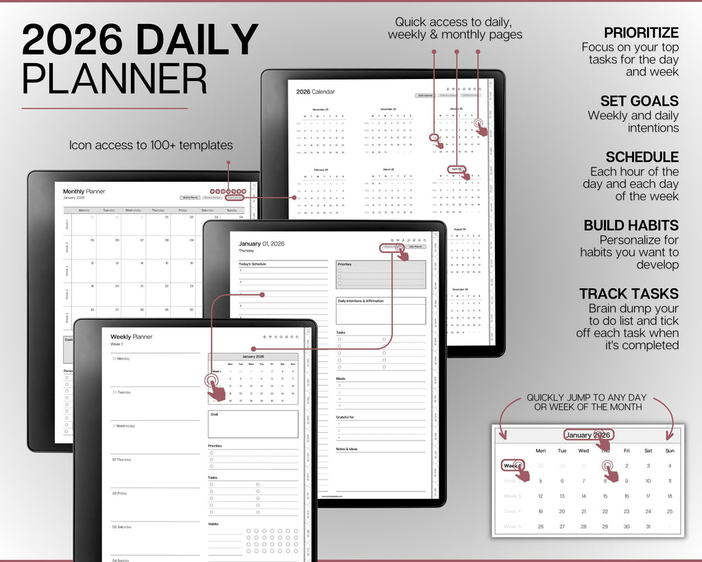 Plan, schedule and organize each day of the week and month with this 2026 hyperlinked digital daily planner, including over 700 pages, 60+ templates, 10 Notebooks and 40 notes templates (Monday and Sunday starts included!)