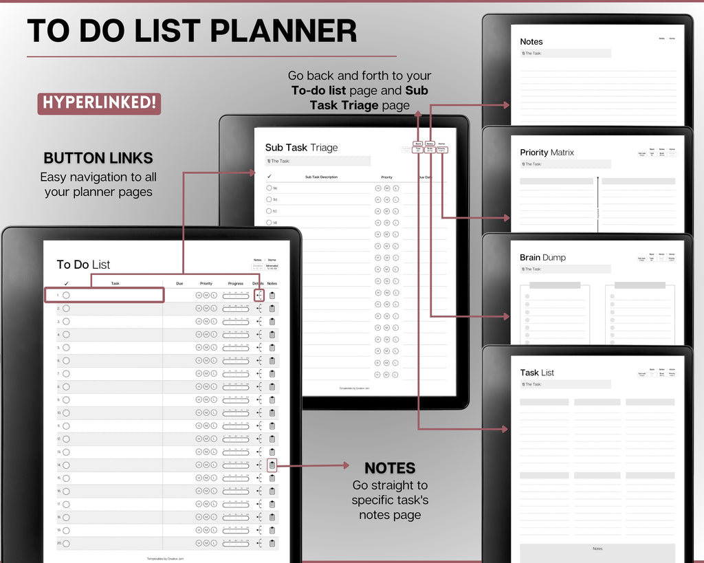 This template has space for you to list and prioritize all your to do's, add subtasks (linked back to the original task), brain dump your thoughts and add notes for up to 20 task groups. Brain dump all your tasks and prioritize them with these hyperlinked to-do list templates - made to be easy and effective so you can focus and be productive.