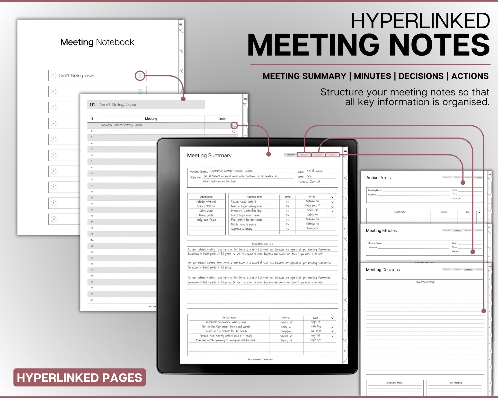 ✔ Templates to capture your meeting summary, the meeting minutes, decisions and action points.