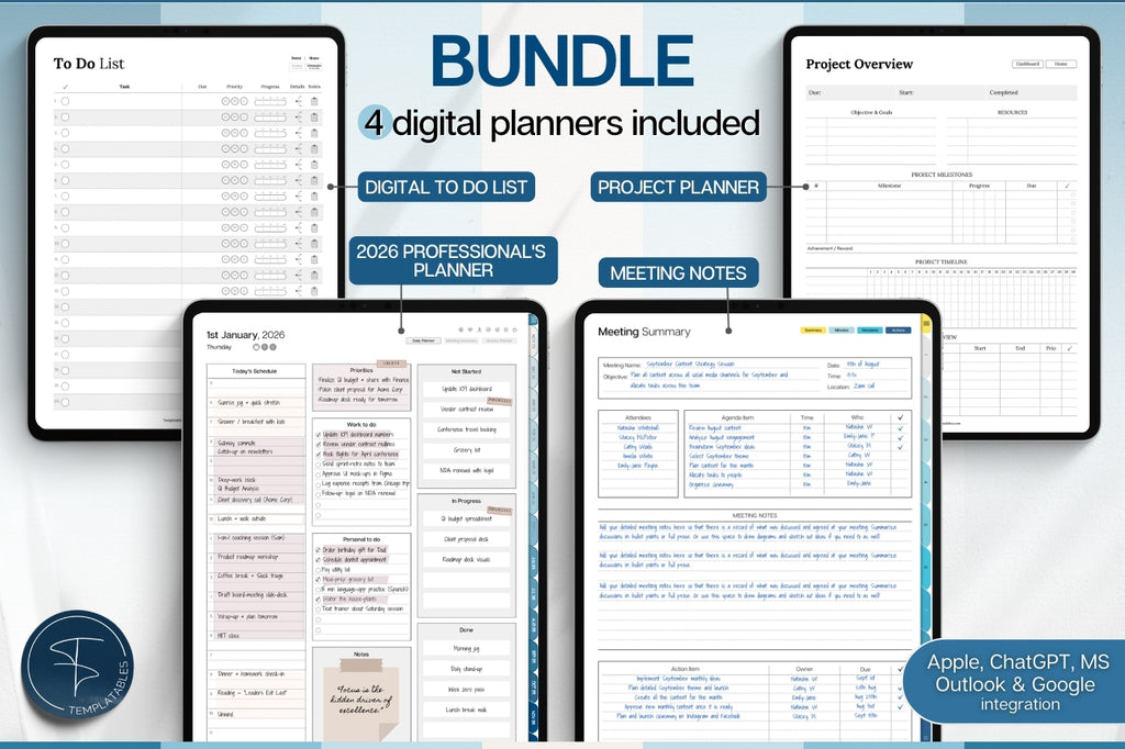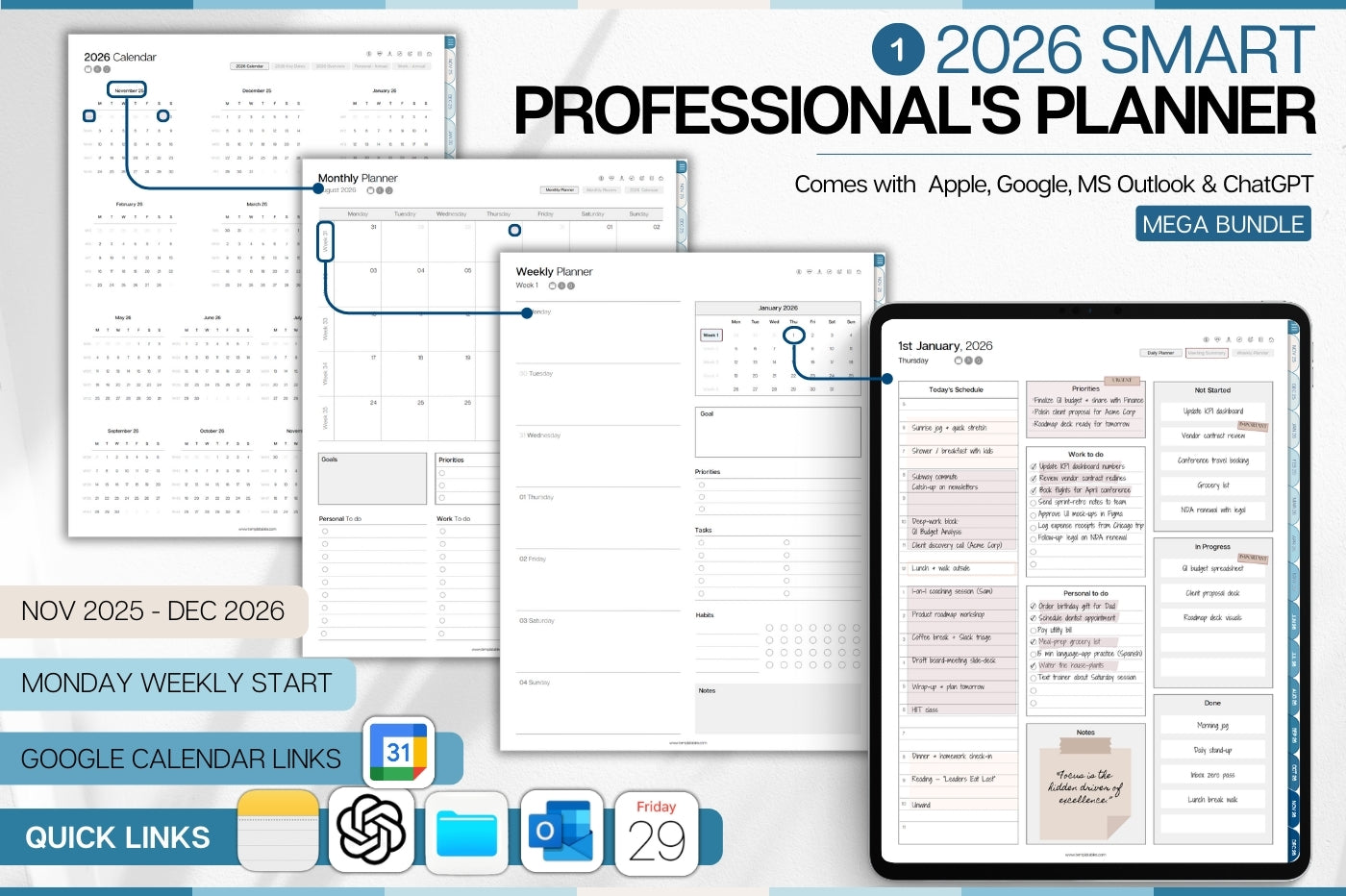2026 Digital Planner MEGA BUNDLE for Professionals | Daily Planner, Project Planner, Digital Notebook & Meeting Notes, Smart Apple Links